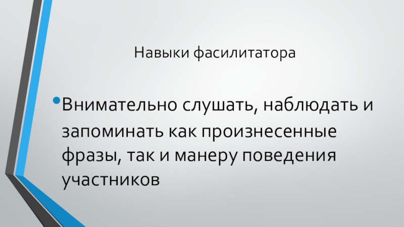 Навыки фасилитатораВнимательно слушать, наблюдать и запоминать как произнесенные фразы, так и манеру поведения участников