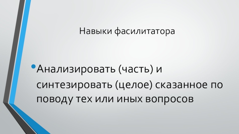 Навыки фасилитатораАнализировать (часть) и синтезировать (целое) сказанное по поводу тех или иных вопросов