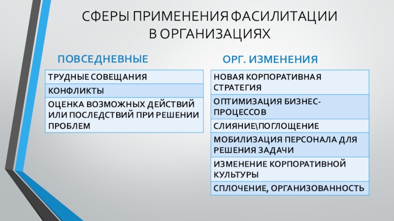 СФЕРЫ ПРИМЕНЕНИЯ ФАСИЛИТАЦИИ В ОРГАНИЗАЦИЯХПОВСЕДНЕВНЫЕ		ОРГ. ИЗМЕНЕНИЯ