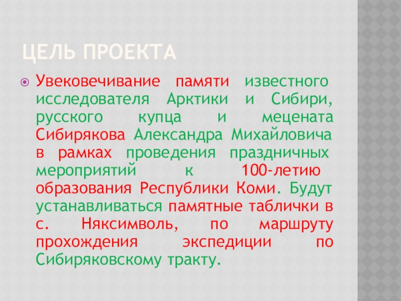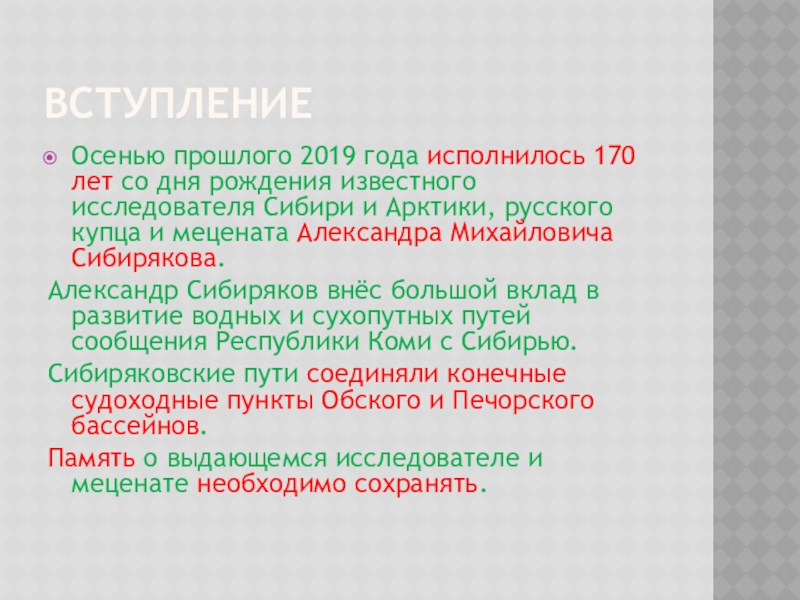 Михайловича Сибирякова.Александр Сибиряков внёс большой вклад в развитие водных и сухопутных путей сообщения Республики Коми с Сибирью.