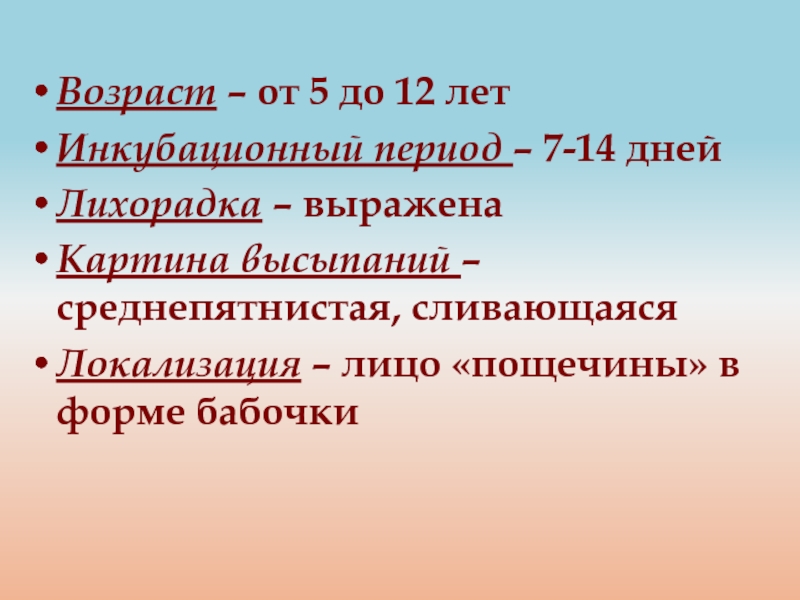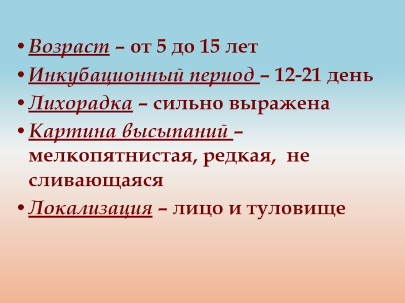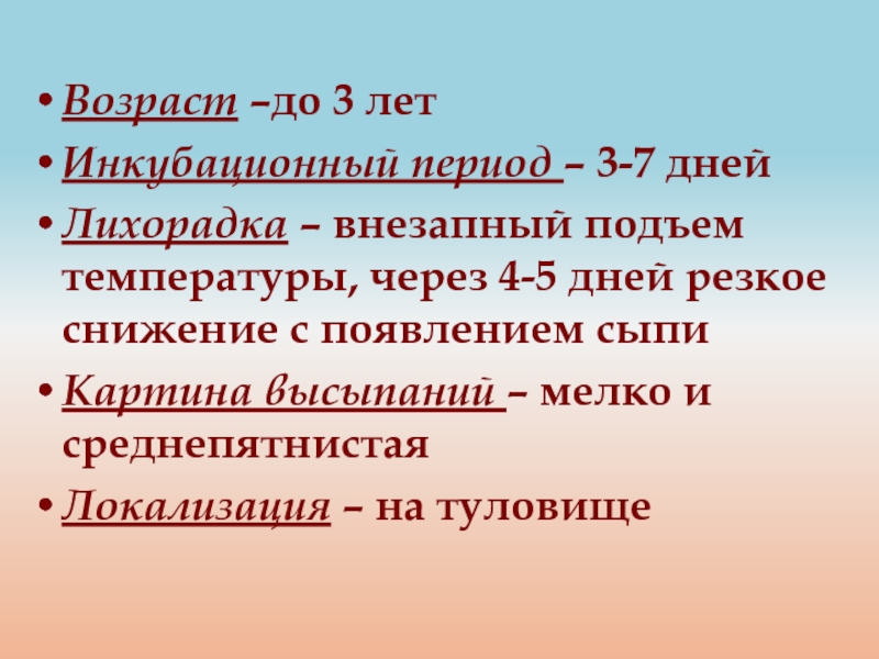 Картина высыпаний – мелкопятнистая, редкая, не сливающаяся