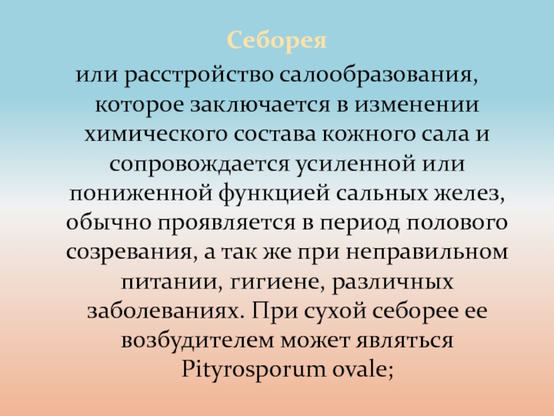 проявляется в период полового созревания, а так же при неправильном питании, гигиене, различных заболеваниях. При сухой себорее ее возбудителем может являться Pityrosporum ovale;