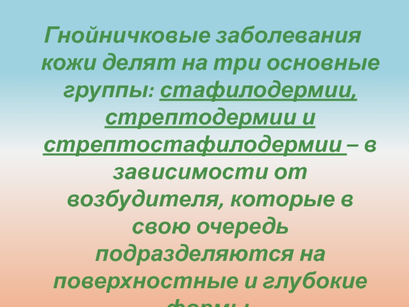 Слайд 18Гнойничковые заболевания кожи делят на три основные группы: стафилодермии, стрептодермии
