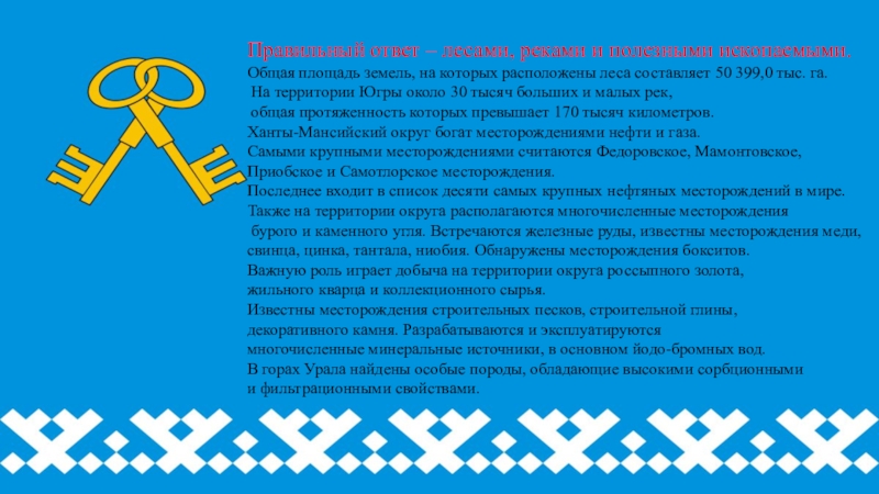 Слайд 11Правильный ответ – лесами, реками и полезными ископаемыми.