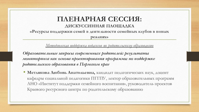 Метлякова Любовь Анатольевна, кандидат педагогических наук, доцент кафедры социальной педагогики ПГГПУ, лектор образовательных программ АНО «Институт поддержки семейного воспитания», руководитель проектов Краевого ресурсного центра по родительскому образованию
