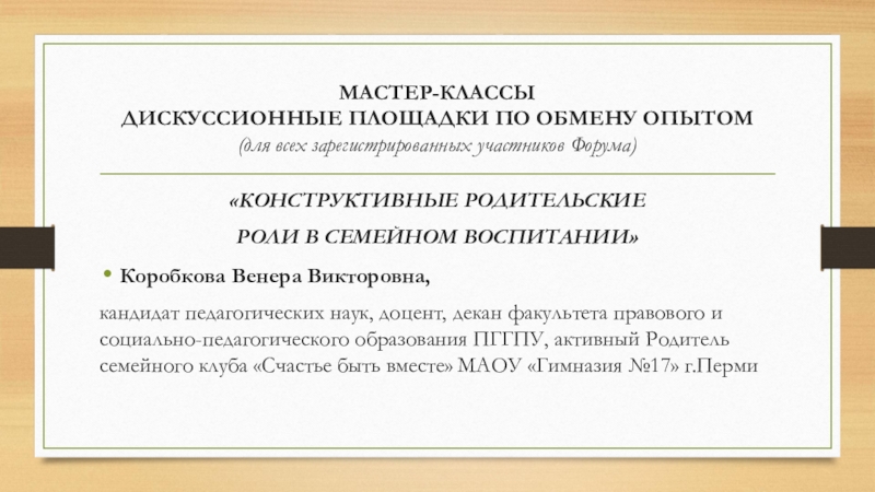 доцент, декан факультета правового и социально-педагогического образования ПГГПУ, активный Родитель семейного клуба «Счастье быть вместе» МАОУ «Гимназия №17» г.Перми