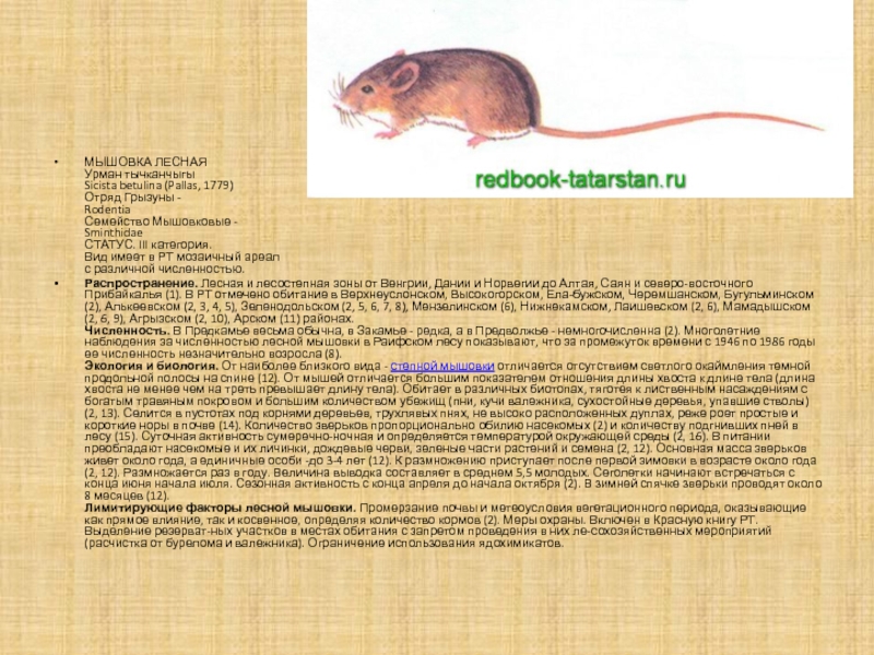 Численность мнемозины. В Европейской части России, в том числе в РТ, она значительно сокращается, особенно в центральных районах. Экология и биология. Места обитания - опушки и поляны в смешанных и лиственных лесах, горные луга, долины ручьев и мелких рек. В настоящее время они подвергаются значительному антропогенному воздействию: лесоразработкам, выпасу и перевыпасу скота под пологом леса» широкому применению пестицидов и др. Вид оседлый, неспособный к миграциям. В год дает одно поколение. Лет бабочек с мая до середины июля, питаются на растениях рода Corydalis (10); гусеницы подъедают листья снизу, отчего малозаметны, хотя любят погреться на солнце. Зимует молодая гусеница, часто не выходящая из яйца. Лимитирующие факторы. Монофагия на растениях p. Corydalis. Ухудшение состояния или полное уничтожение мест обитания вследствие хозяйственной деятельности. Истребление кормовых растений сенокошением. Увеличение рекреационных нагрузок, отлов бабочек неспециалистами.