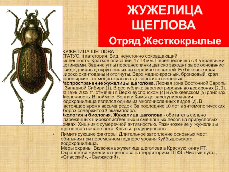 Меры охраны. Включена жужелица щеголова в Красную книгу РТ. Охраняется жужелица щеголова на территориях ГПКЗ «Чистые луга», «Спасский», «Свияжский».