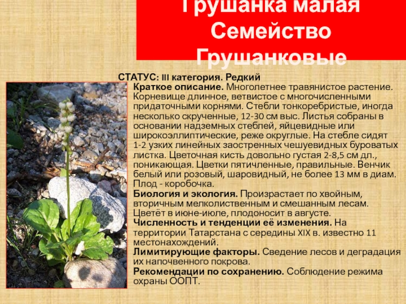 тонкоребристые, иногда несколько скрученные, 12-30 см выс. Листья собраны в основании надземных стеблей, яйцевидные или широкоэллиптические, реже округлые. На стебле сидят 1-2 узких линейных заостренных чешуевидных буроватых листка. Цветочная кисть довольно густая 2-8,5 см дл., поникающая. Цветки пятичленные, правильные. Венчик белый или розовый, шаровидный, не более 13 мм в диам. Плод - коробочка.