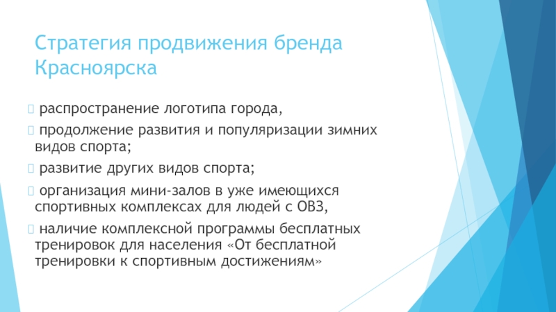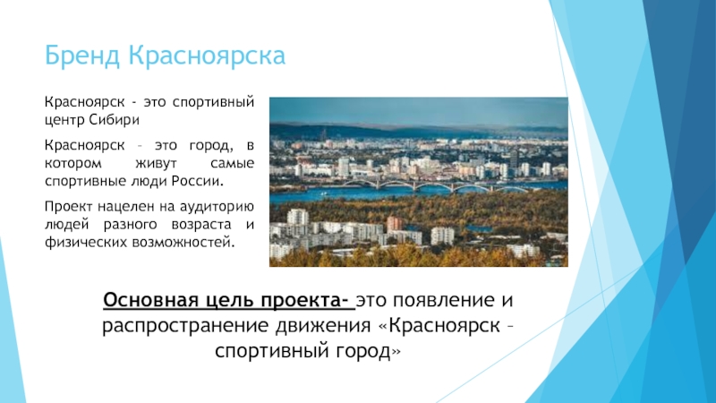 на аудиторию людей разного возраста и физических возможностей. Основная цель проекта- это появление и распространение движения «Красноярск –спортивный город»
