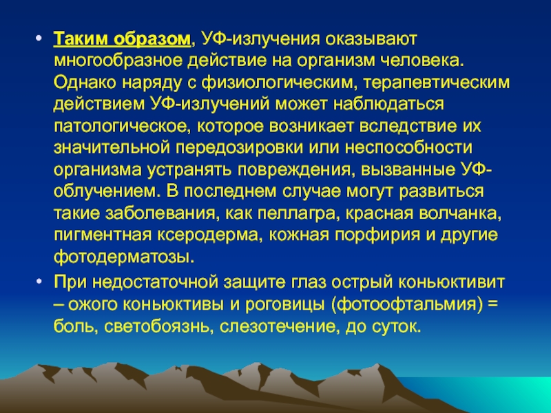 Слайд 16Таким образом, УФ-излучения оказывают многообразное действие на организм человека. Однако