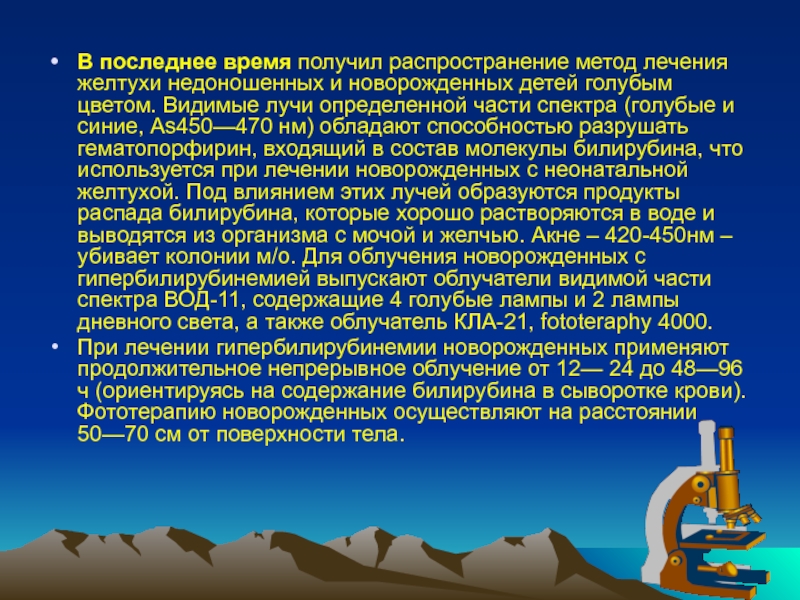 и синие, As450—470 нм) обладают способностью разрушать гематопорфирин, входящий в состав молекулы билирубина, что используется при лечении новорожденных с неонатальной желтухой. Под влиянием этих лучей образуются продукты распада билирубина, которые хорошо растворяются в воде и выводятся из организма с мочой и желчью. Акне – 420-450нм – убивает колонии м/о. Для облучения новорожденных с гипербилирубинемией выпускают облучатели видимой части спектра ВОД-11, содержащие 4 голубые лампы и 2 лампы дневного света, а также облучатель КЛА-21, fototeraphy 4000.