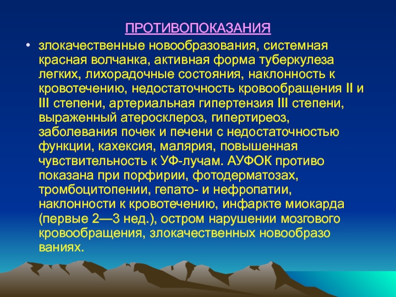 артериальная гипертензия III степени, выраженный атеросклероз, гипертиреоз, заболевания почек и печени с недостаточностью функции, кахексия, малярия, повышенная чувствительность к УФ-лучам. АУФОК противопоказана при порфирии, фотодерматозах, тромбоцитопении, гепато- и нефропатии, наклонности к кровотечению, инфаркте миокарда (первые 2—3 нед.), остром нарушении мозгового кровообращения, злокачественных новообразованиях.