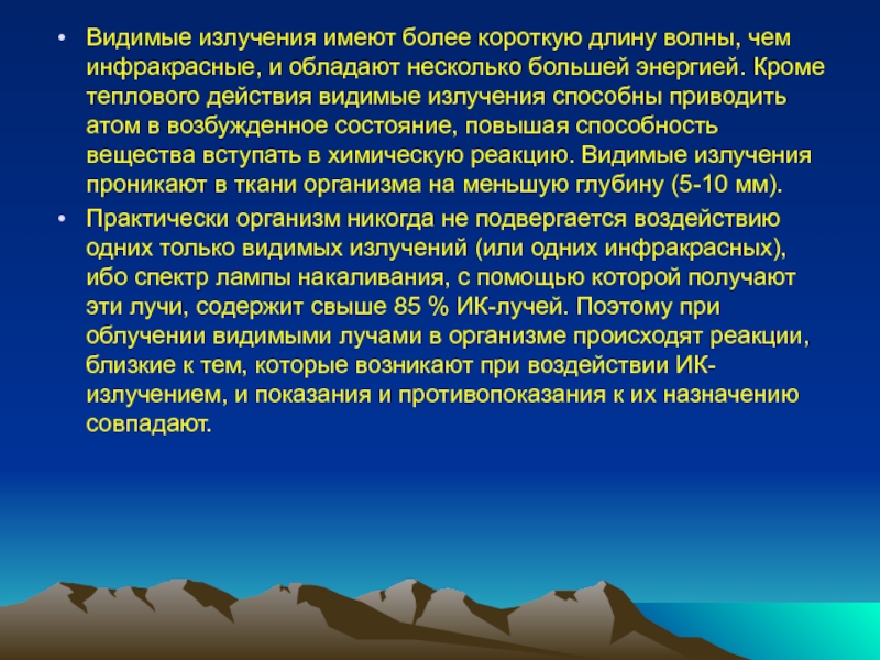 приводить атом в возбужденное состояние, повышая способность вещества вступать в химическую реакцию. Видимые излучения проникают в ткани организма на меньшую глубину (5-10 мм).