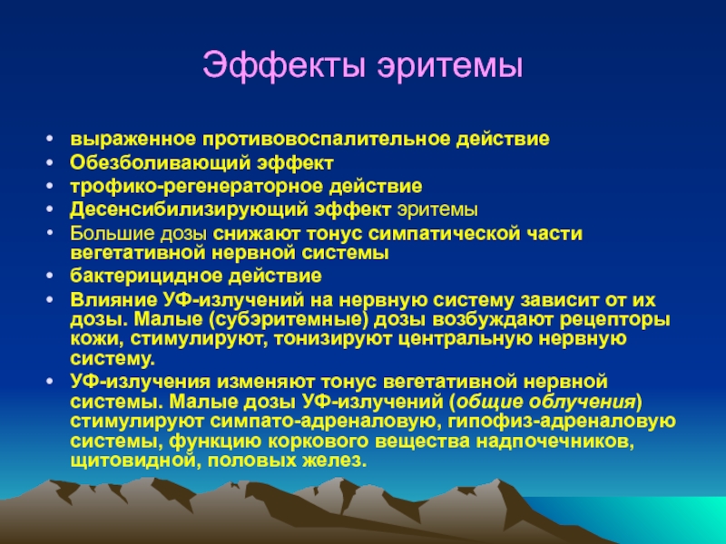 Влияние УФ-излучений на нервную систему зависит от их дозы. Малые (субэритемные) дозы возбуждают рецепторы кожи, стимулируют, тонизируют центральную нервную систему.