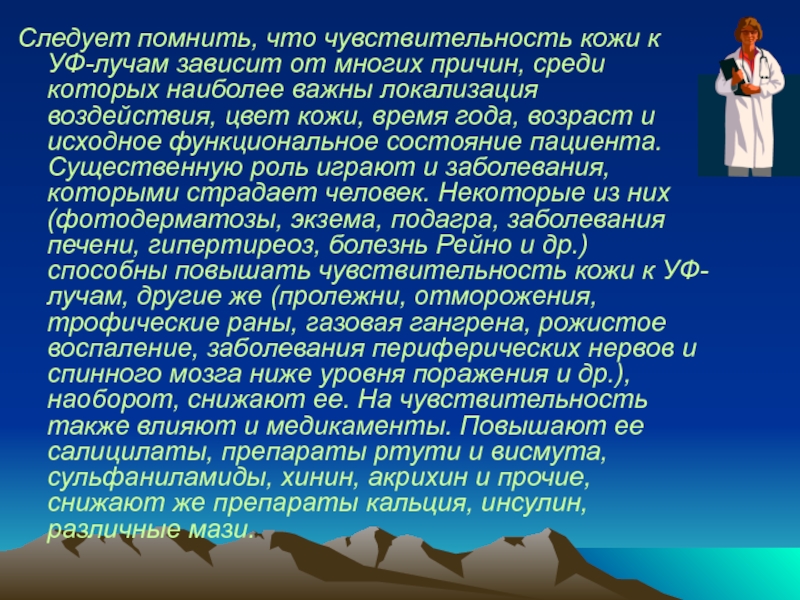 года, возраст и исходное функциональное состояние пациента. Существенную роль играют и заболевания, которыми страдает человек. Некоторые из них (фотодерматозы, экзема, подагра, заболевания печени, гипертиреоз, болезнь Рейно и др.) способны повышать чувствительность кожи к УФ-лучам, другие же (пролежни, отморожения, трофические раны, газовая гангрена, рожистое воспаление, заболевания периферических нервов и спинного мозга ниже уровня поражения и др.), наоборот, снижают ее. На чувствительность также влияют и медикаменты. Повышают ее салицилаты, препараты ртути и висмута, сульфаниламиды, хинин, акрихин и прочие, снижают же препараты кальция, инсулин, различные мази.