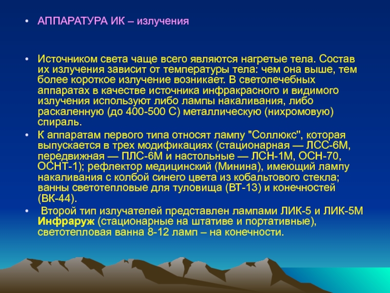 тем более короткое излучение возникает. В светолечебных аппаратах в качестве источника инфракрасного и видимого излучения используют либо лампы накаливания, либо раскаленную (до 400-500 С) металлическую (нихромовую) спираль.