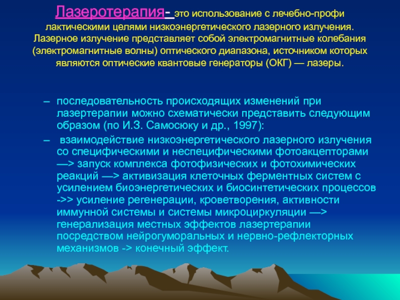 Слайд 20Лазеротерапия- это использование с лечебно-профилактическими целями низкоэнергетического лазерного излучения. Лазерное