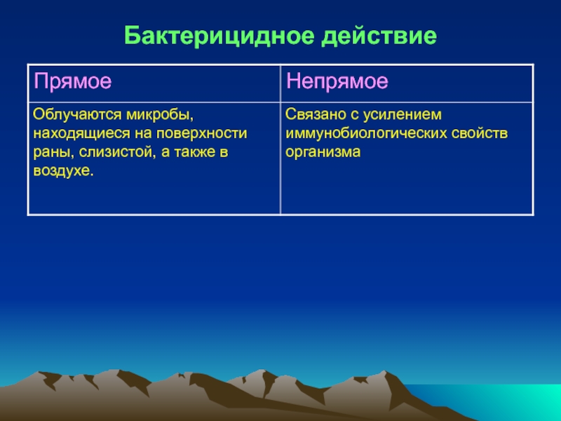 Важное биологическое значение имеет бактерицидное действие УФ-излучений, которое обусловлено их влиянием на субстанцию клетки. При УФ-облучении вначале происходит раздражение бактерий, то есть активизация их жизнедеятельности, затем угнетение жизнедеятельности, утрата способности к многократному воспроизведению, формированию колоний вследствие нарушения обмена нуклеиновых кислот (бактериостатическое действие), и, наконец, коагуляция белков — гибель бактерий (бактерицидное, летальное действие).