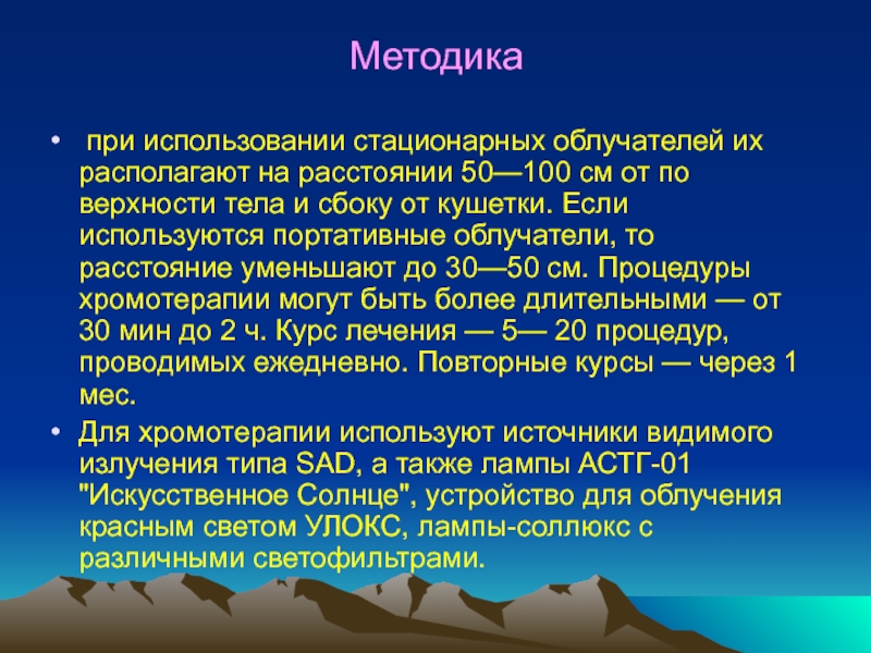 портативные облучатели, то расстояние уменьшают до 30—50 см. Процедуры хромотерапии могут быть более длительными — от 30 мин до 2 ч. Курс лечения — 5— 20 процедур, проводимых ежедневно. Повторные курсы — через 1 мес.