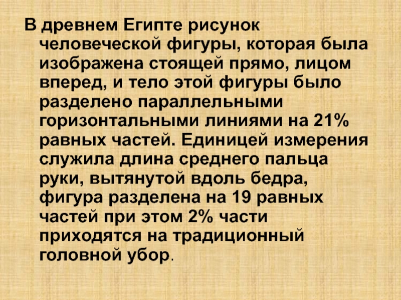 горизонтальными линиями на 21% равных частей. Единицей измерения служила длина среднего пальца руки, вытянутой вдоль бедра, фигура разделена на 19 равных частей при этом 2% части приходятся на традиционный головной убор.