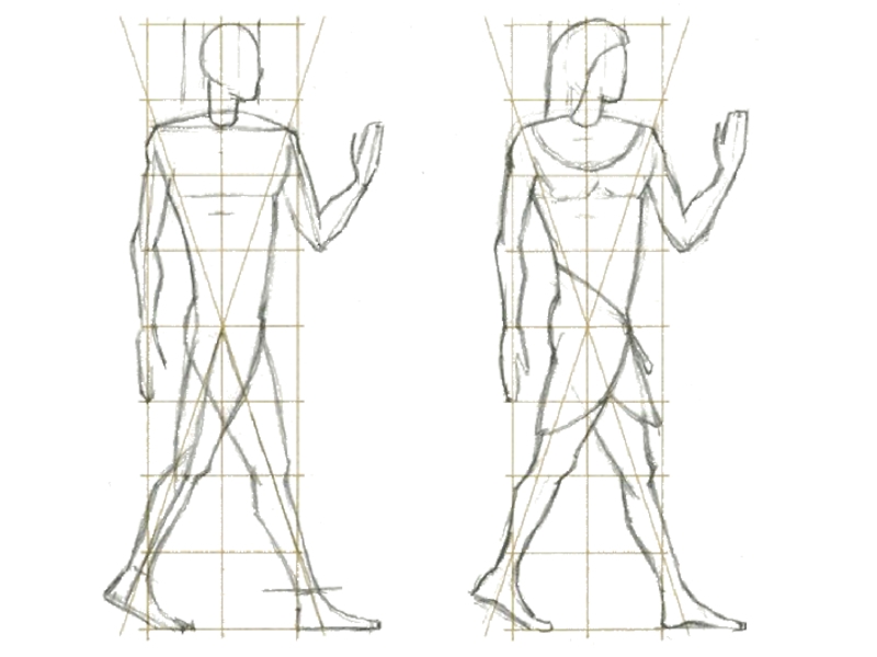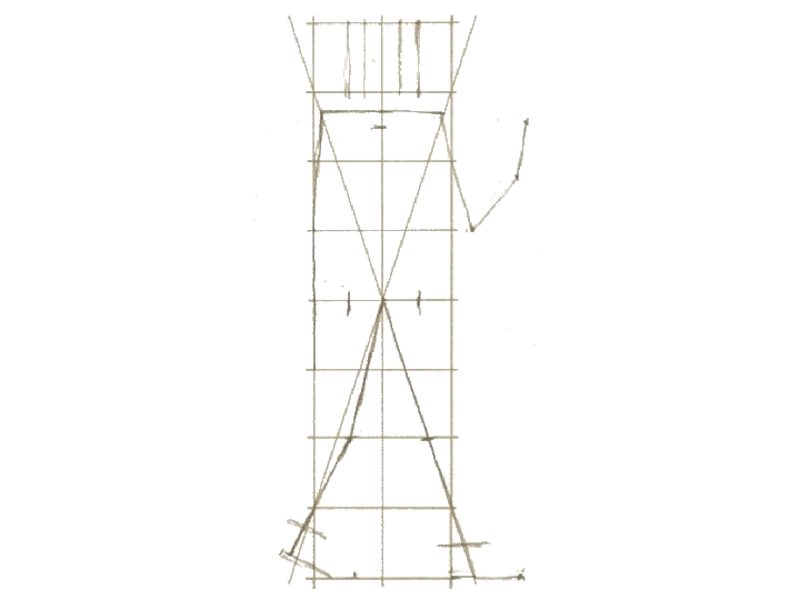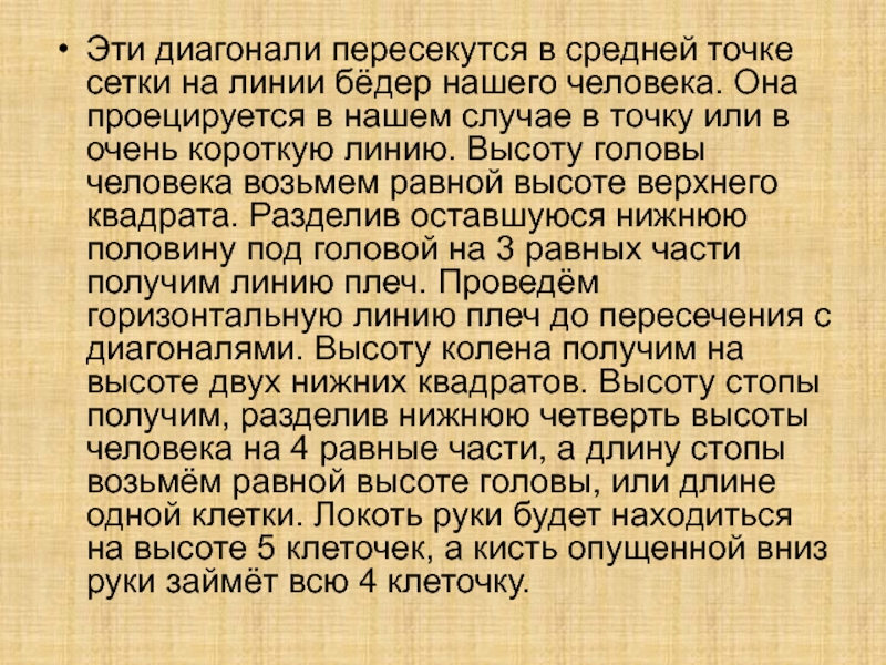 в очень короткую линию. Высоту головы человека возьмем равной высоте верхнего квадрата. Разделив оставшуюся нижнюю половину под головой на 3 равных части получим линию плеч. Проведём горизонтальную линию плеч до пересечения с диагоналями. Высоту колена получим на высоте двух нижних квадратов. Высоту стопы получим, разделив нижнюю четверть высоты человека на 4 равные части, а длину стопы возьмём равной высоте головы, или длине одной клетки. Локоть руки будет находиться на высоте 5 клеточек, а кисть опущенной вниз руки займёт всю 4 клеточку.