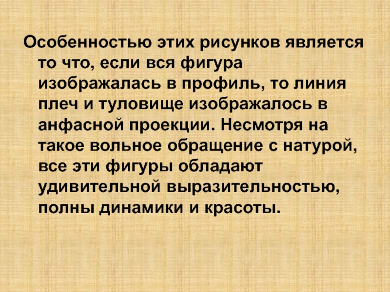Особенностью этих рисунков является то что, если вся фигура изображалась в профиль, то линия плеч и туловище