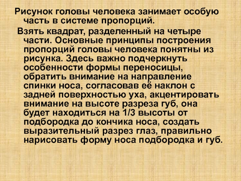 Слайд 14Рисунок головы человека занимает особую часть в системе пропорций.