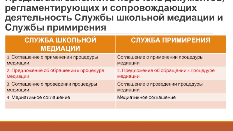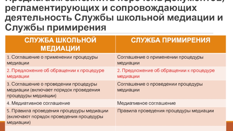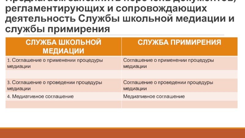 Слайд 20Предлагаем заполнить перечень документов, регламентирующих и сопровождающих деятельность Службы школьной