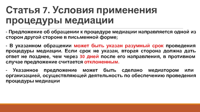 Слайд 11Статья 7. Условия применения процедуры медиации