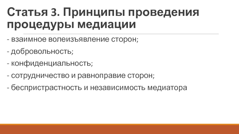 Слайд 6Статья 3. Принципы проведения процедуры медиации