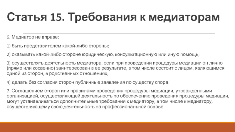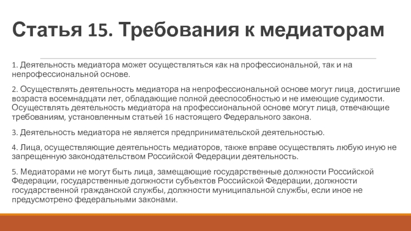 Слайд 26Статья 16. Осуществление деятельности медиатора на профессиональной основе