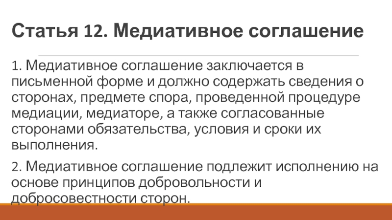 Слайд 14Статья 8. Соглашение о проведении процедуры медиации