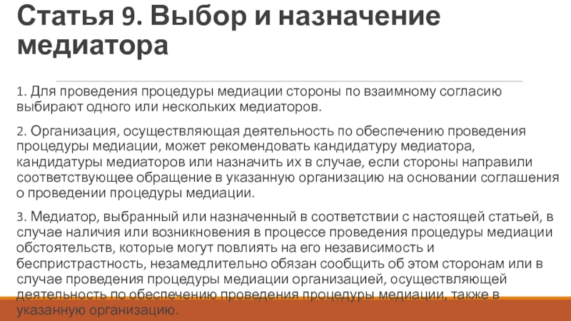 Слайд 15Статья 9. Выбор и назначение медиатора