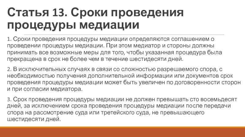 Слайд 22Статья 13. Сроки проведения процедуры медиации