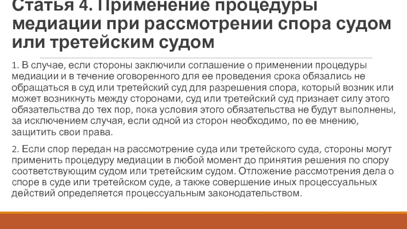 Слайд 7Статья 4. Применение процедуры медиации при рассмотрении спора судом или