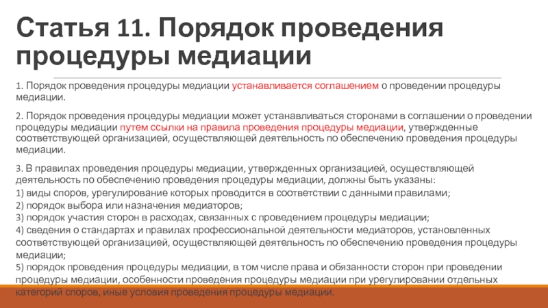 Слайд 18Статья 11. Порядок проведения процедуры медиации
