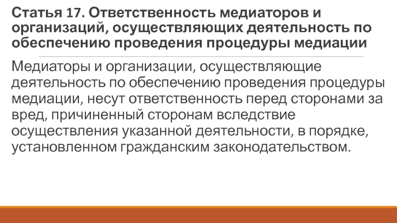 Слайд 27Статья 17. Ответственность медиаторов и организаций, осуществляющих деятельность по обеспечению