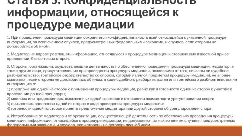 Слайд 8Статья 5. Конфиденциальность информации, относящейся к процедуре медиации