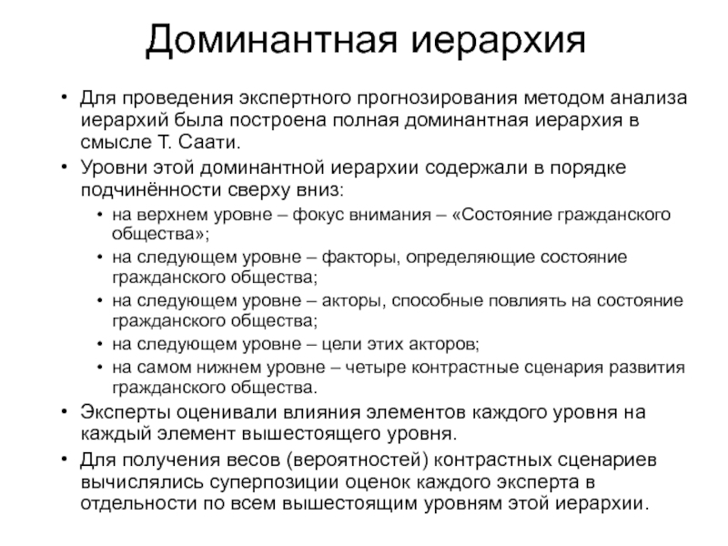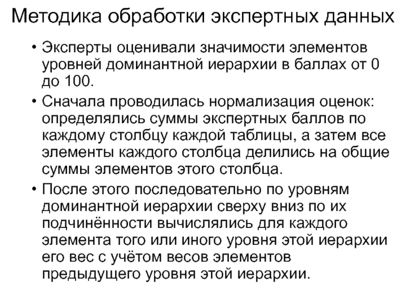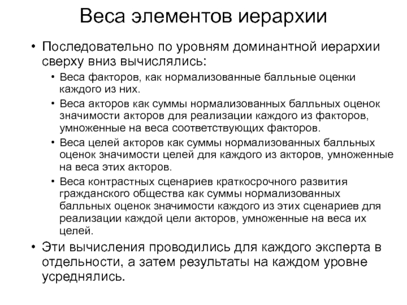 После этого последовательно по уровням доминантной иерархии сверху вниз по их подчинённости вычислялись для каждого элемента того или иного уровня этой иерархии его вес с учётом весов элементов предыдущего уровня этой иерархии.