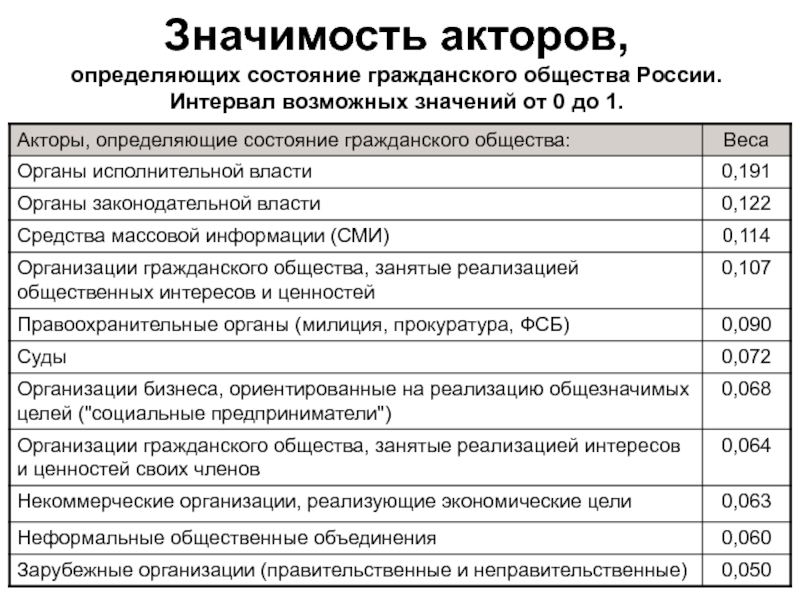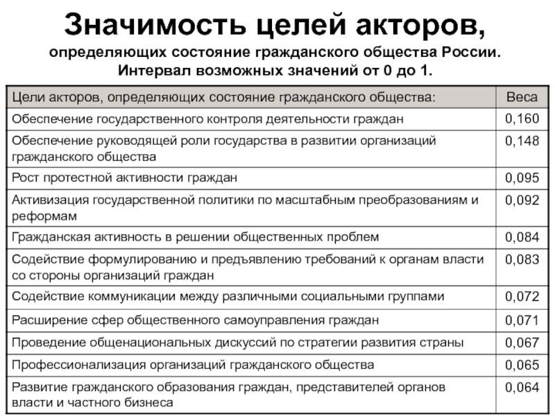Применённая методика краткосрочного сценарного прогнозирования развития гражданского общества предоставила экспертам возможности сравнивать влияния на это развитие различных факторов, акторов и их целей, определяющих состояние гражданского общества.