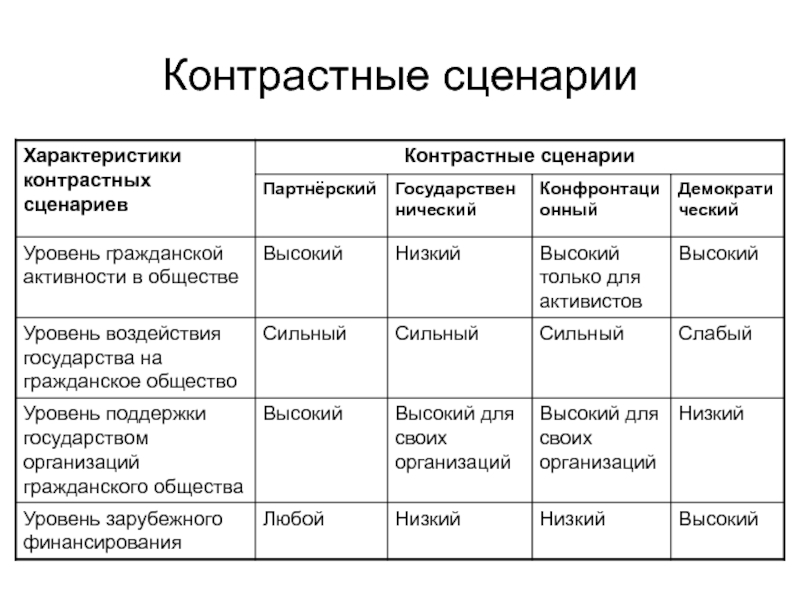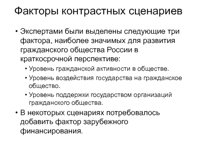 Контрастные сценарии включают наиболее значимые тенденции развития гражданского общества, которые были выявлены в результате предварительного экспертного оценивания комплексов тенденций и факторов.
