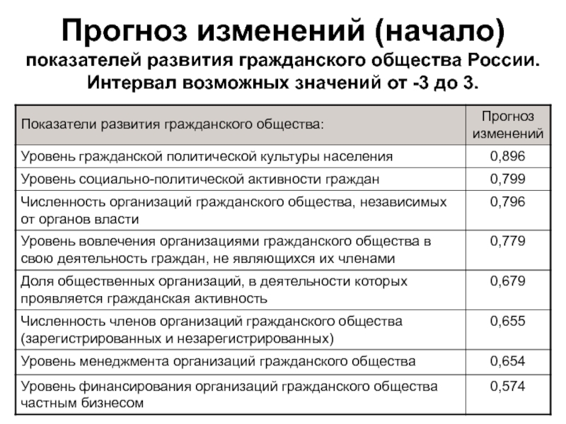 Слайд 16Прогноз изменений (начало) показателей развития гражданского общества России.