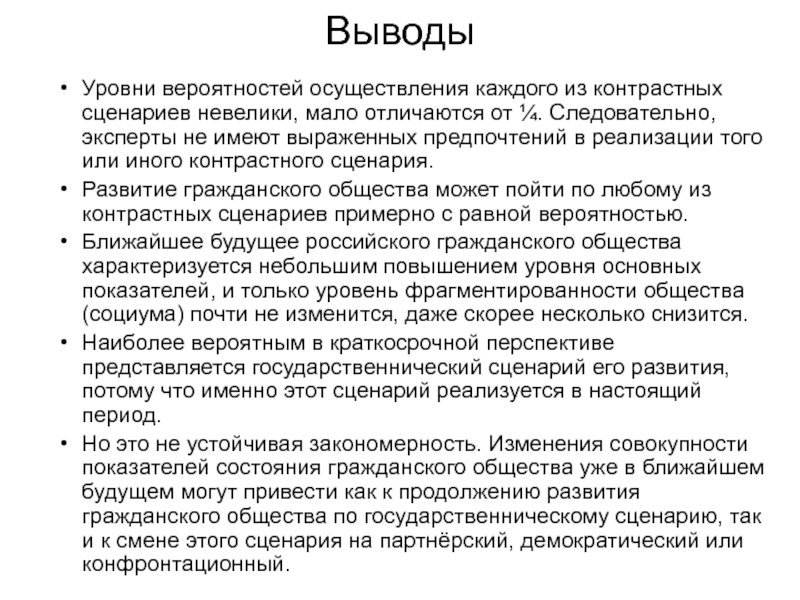 Но это не устойчивая закономерность. Изменения совокупности показателей состояния гражданского общества уже в ближайшем будущем могут привести как к продолжению развития гражданского общества по государственническому сценарию, так и к смене этого сценария на партнёрский, демократический или конфронтационный.