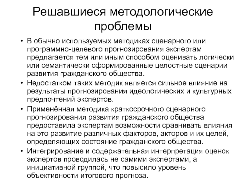Интегрирование и содержательная интерпретация оценок экспертов проводилась не самими экспертами, а инициативной группой, что повысило уровень объективности итогового прогноза.
