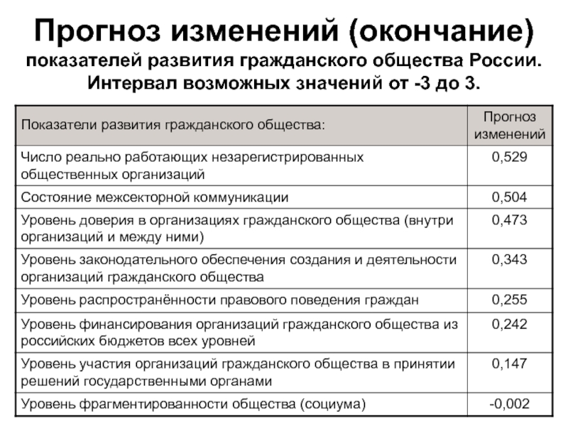 Слайд 17Прогноз изменений (окончание) показателей развития гражданского общества России.