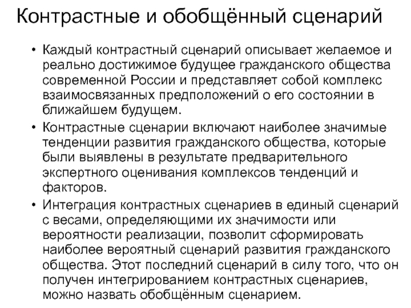 Интеграция контрастных сценариев в единый сценарий с весами, определяющими их значимости или вероятности реализации, позволит сформировать наиболее вероятный сценарий развития гражданского общества. Этот последний сценарий в силу того, что он получен интегрированием контрастных сценариев, можно назвать обобщённым сценарием.