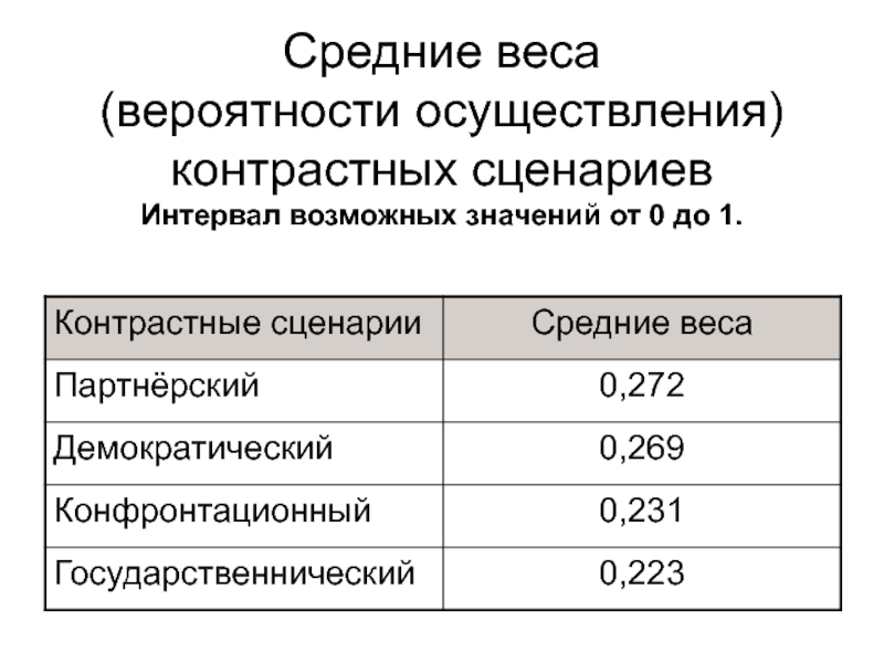 Для получения весов (вероятностей) контрастных сценариев вычислялись суперпозиции оценок каждого эксперта в отдельности по всем вышестоящим уровням этой иерархии.