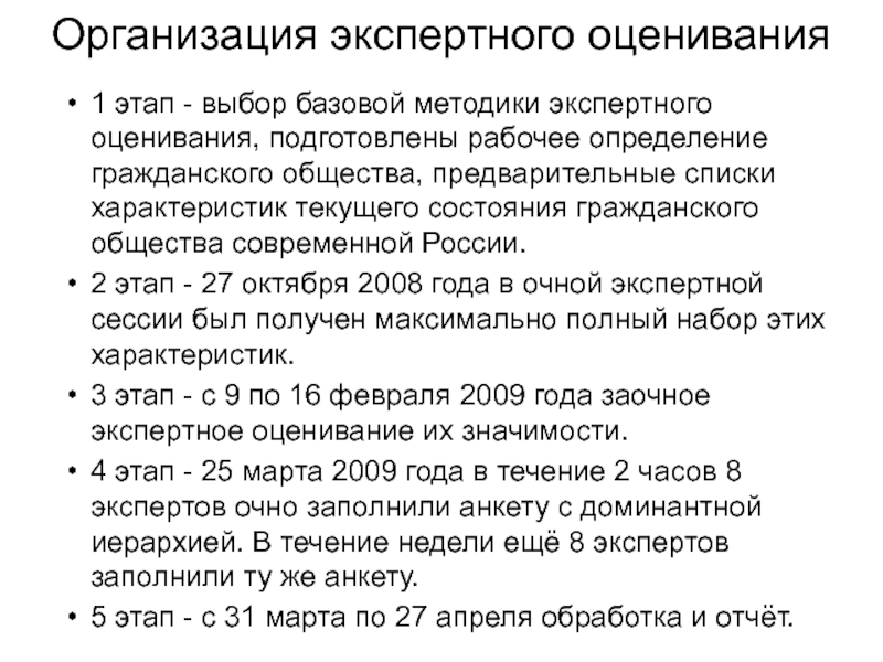4 этап - 25 марта 2009 года в течение 2 часов 8 экспертов очно заполнили анкету с доминантной иерархией. В течение недели ещё 8 экспертов заполнили ту же анкету.