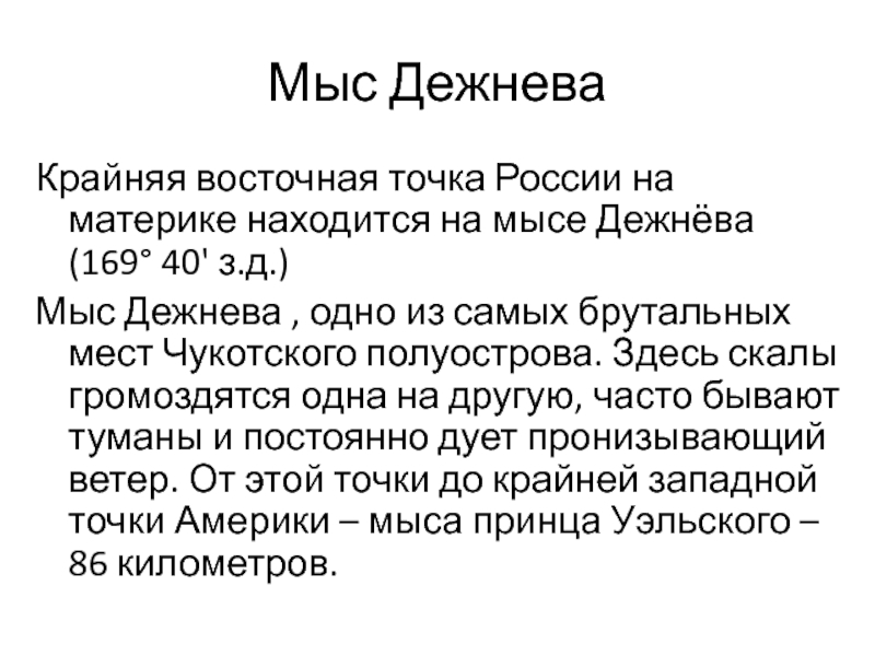 мест Чукотского полуострова. Здесь скалы громоздятся одна на другую, часто бывают туманы и постоянно дует пронизывающий ветер. От этой точки до крайней западной точки Америки – мыса принца Уэльского – 86 километров.